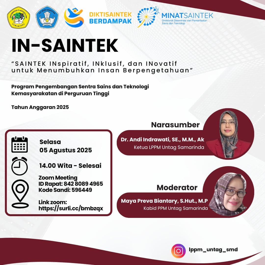 SAMARINDA – Dalam upaya mendorong inovasi dan pengembangan ilmu pengetahuan di lingkungan perguruan tinggi, Lembaga Penelitian dan Pengabdian kepada Masyarakat (LPPM) Untag Samarinda sukses menyelenggarakan sosialisasi program IN-SAINTEK (SAINTEK INspiratif, Inklusif, dan INovatif). Kegiatan ini dilaksanakan secara daring pada Selasa, 05 Agustus 2025.